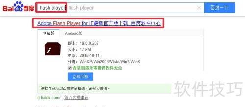 8、 大家也可以通过百度搜索Adobe Flash Player插件,下载并安装,操作简单方便。若为首次安装,推荐采用此方法,速度更快,效率更高。