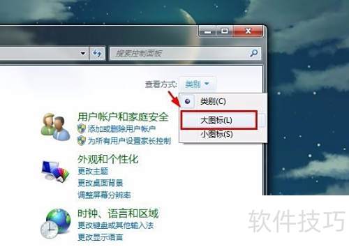 2、 将计算机设置的查看方式从默认的类别调整为大图标模式。