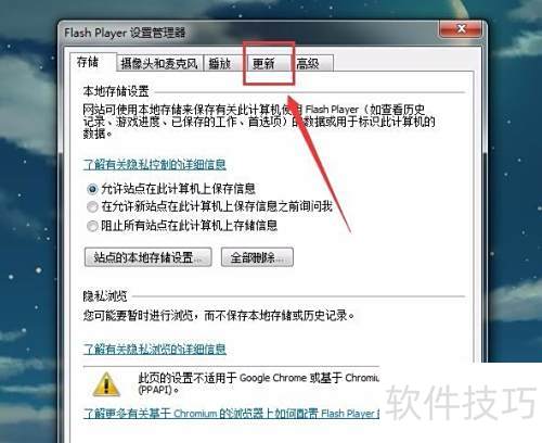 4、 在更新菜单中可找到Flash Player的更新设置,系统默认会自动下载并安装最新版本,确保软件始终保持最新状态。