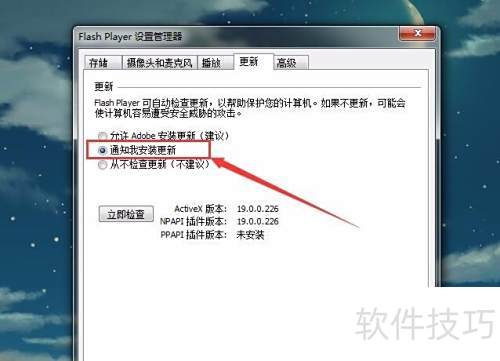 5、 建议将更新设置为通知安装,这样在需要重要更新时能及时知晓,同时保有选择是否更新的自由,既掌握了更新主动权,又避免了不必要的自动更新,特别是对于Adobe Flash Player这类软件,可有效关闭其自动更新功能,提升使用体验。