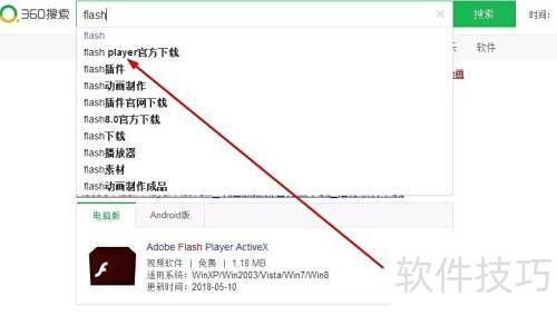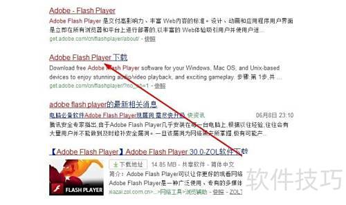 1、 在浏览器中输入Adobe Flash Player进行搜索并点击进入。