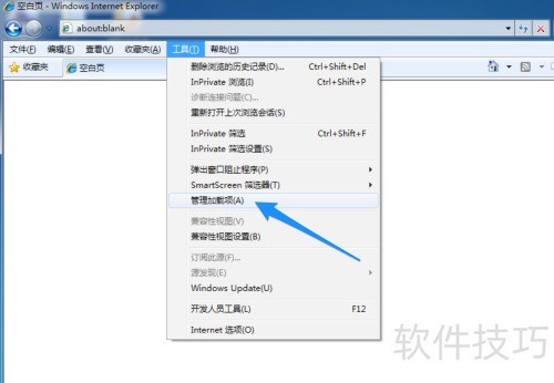 2、 在工具菜单中选择管理加载项,操作所示。