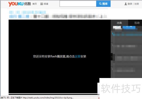 4、 关闭 Adobe Flash Player 后,随意打开一个视频网站,播放视频时会出现电脑未安装 Flash 播放器的提示信息,具体所示。