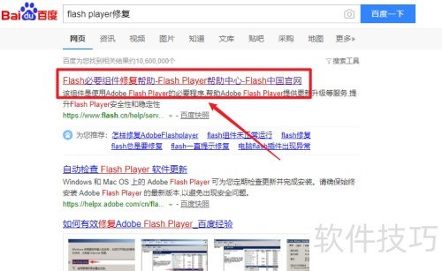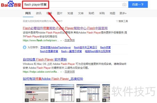 1、 在浏览器中输入Adobe Flash Player修复进行搜索即可找到相关解决方案。