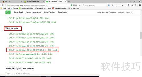 2、 在官网中查找适用于Windows 32位的Qt x.x.x(MinGW)安装包,点击对应链接即可开始下载。