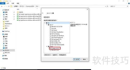 3、 运行已下载的安装程序,选择Qt的安装路径后进入Qt设置界面。在此界面中可勾选需要安装的组件,在目录下Qt Creator已被默认选中,表示安装过程将自动下载并配置该开发工具。完成组件选择后,连续点击下一步按钮,按照提示逐步操作,即可顺利完成Qt框架及Qt Creator的完整安装。