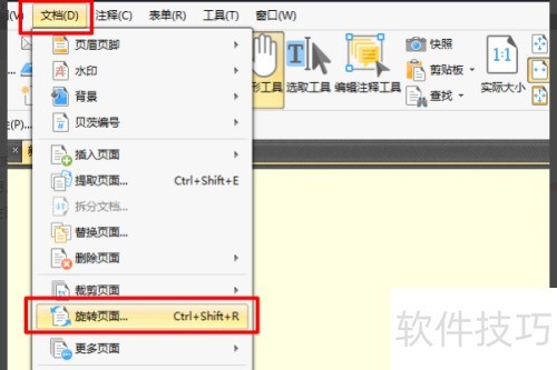1、 打开PDF文件,点击菜单栏的文档选项,找到旋转页面功能并点击使用。