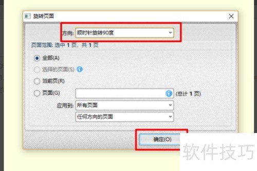 2、 点击旋转页面工具后,可选择顺时针或逆时针方向,设定需旋转的页面范围,确认无误后点击确定即可完成操作。