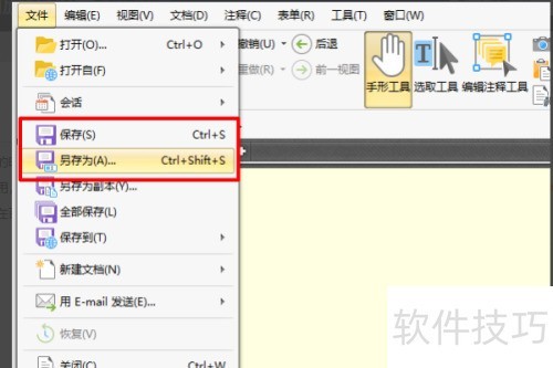 5、 修改文件后,点击菜单栏的文件选项,除打开外还可保存。选择保存或另存为即可完成文件存储。