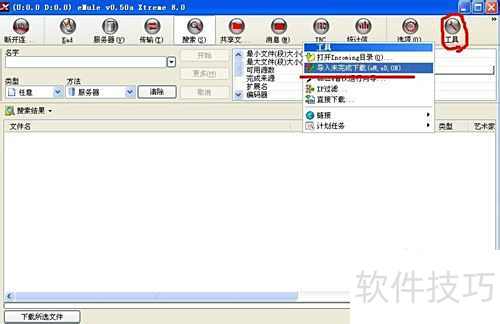 3、 将备份文件夹复制至新网络环境,启动电骡客户端,点击工具菜单,选择导入未完成下载,操作3所示。
