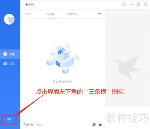 1、 打开迅雷,点击左下角三条横线图标即可。
