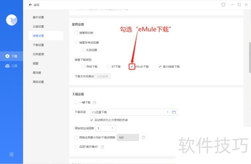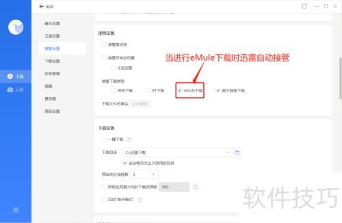 3、 查看需接管的下载任务类型,选择eMule下载,并勾选该选项即可。