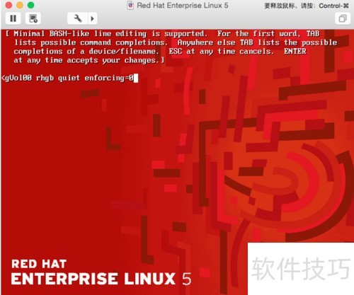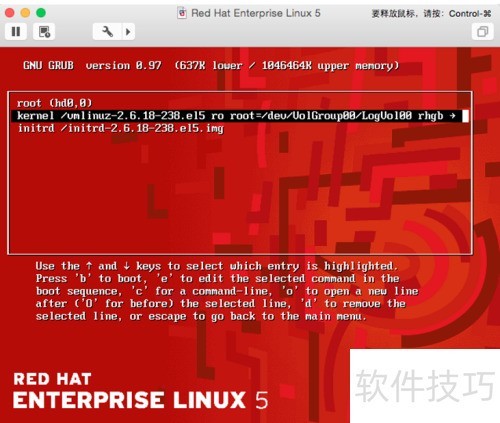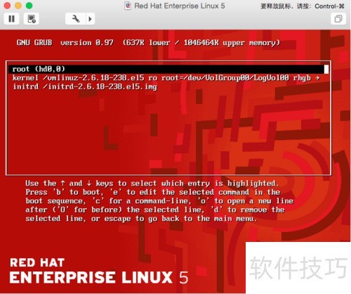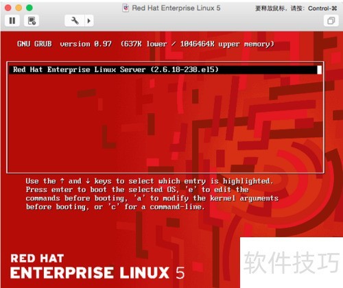 2、 启动RedHat系统时,在GRUB倒计时阶段按下任意键即可中断启动过程。