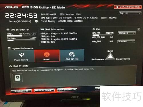 7、 进入BIOS后按F7键切换至高级模式,本例主板为华硕型号。