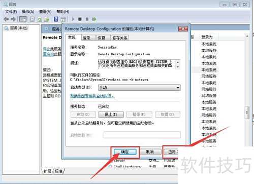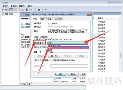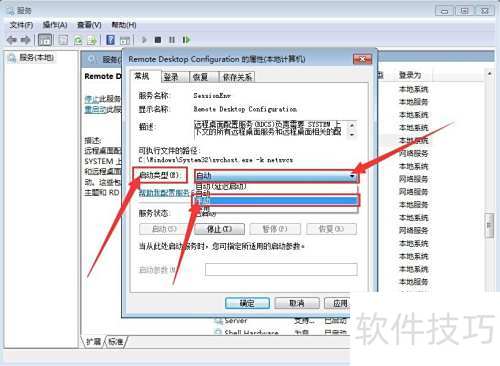 7、 若需将远程桌面配置服务设为手动启动,可先按步骤1至5操作,在步骤5的下拉菜单中选择手动选项,确认后继续执行步骤6即可完成设置。整个过程操作简单,只需在服务属性中调整启动类型即可生效。