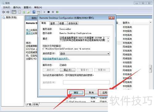 6、 此时,点击远程桌面配置服务属性窗口下方的应用按钮,完成设置后,再点击确定按钮即可保存更改。