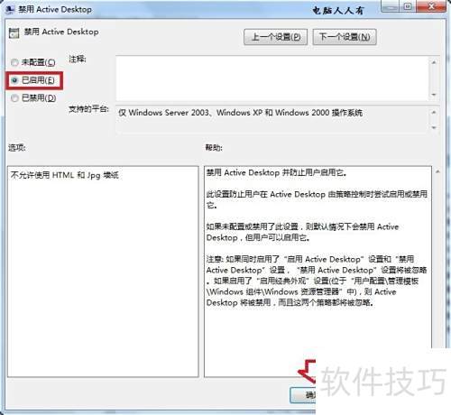 8、 禁用活动桌面策略,选择已启用,点击确定完成设置。