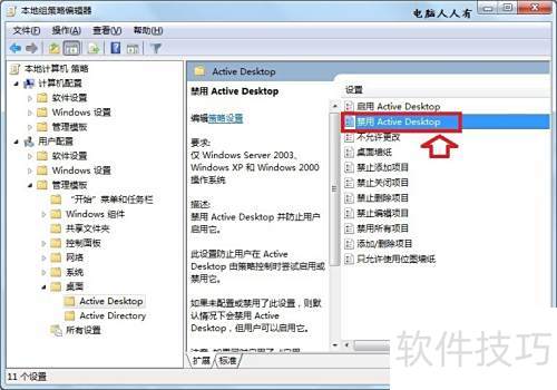 7、 打开本地组策略编辑器,依次进入用户配置、管理模板、桌面、Active Desktop,然后双击禁用Active Desktop选项进行设置。