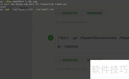 4、 上传文件命令格式为:put 本地文件路径 目标文件路径。例如:put /home/user/file.txt /remote/file.txt。