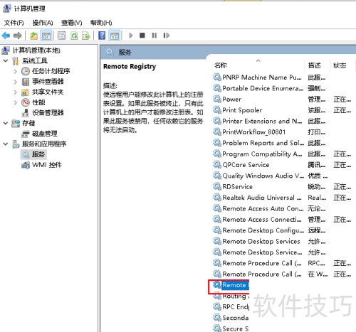 5、 在右侧列表中找到远程注册表服务,双击启动即可。