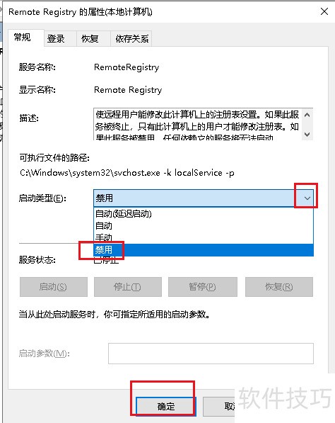 6、 打开启动类型下拉框,选择禁用并确认,完成设置。