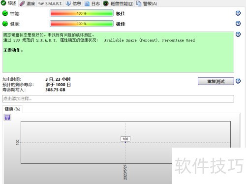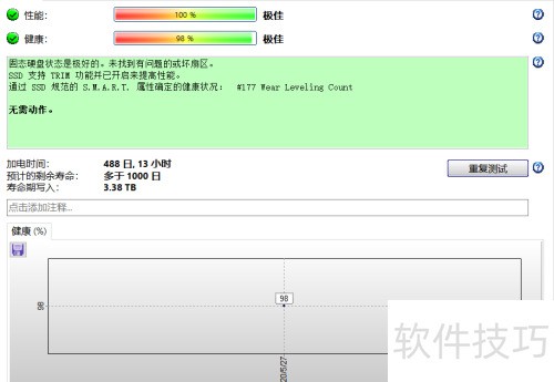 3、 接下来通过软件查看系统盘,固态硬盘写入量较小,但因长期开机运行,已损耗约2%。