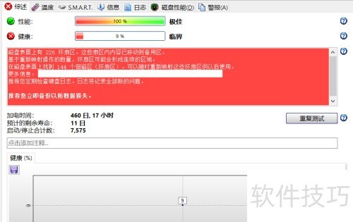 5、 使用WD红盘进行测试,这是一块理论上有损坏的硬盘。通过Hard Disk Sentinel检测可见,其健康状况远不如前,已接近报废。尽管如此,仍可继续使用未损坏的扇区,只需避免存放重要数据,合理利用剩余价值即可。