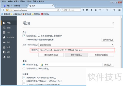 5、 进入选项页面后,定位到常规设置,选择启动Firefox时显示主页,并点击使用当前页面按钮进行确认。此时需检查主页文本框中的地址是否已更改为所需主页地址,确保设置生效。(已验证可行)