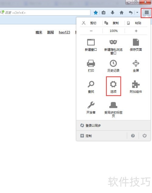1、 启动火狐浏览器,点击右上角菜单按钮,从中选择选项进入设置界面。