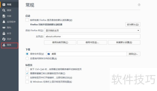 2、 在浏览器设置的左侧栏,点击切换至高级选项。
