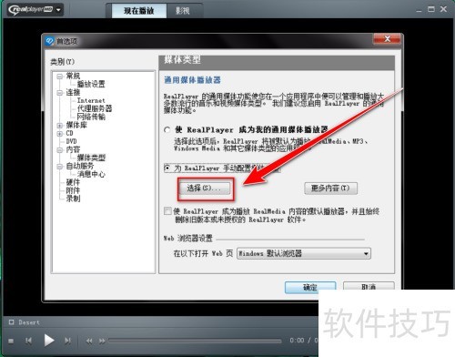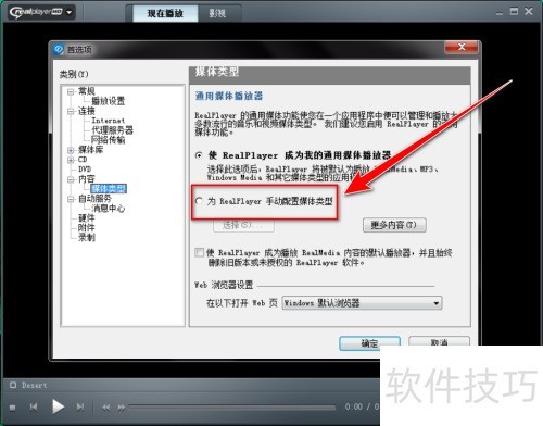4、 在媒体类型页面,选择手动为RealPlayer配置媒体类型选项。