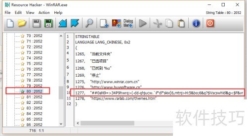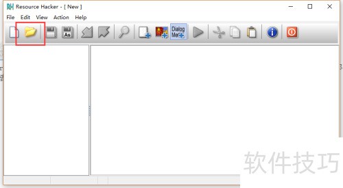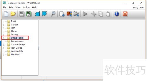 4、 启动Resource Hacker,选择文件菜单中的打开选项,或直接使用工具栏的打开按钮,浏览至WinRAR的安装路径,选中并加载其中的WinRAR.exe文件。