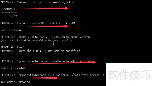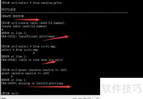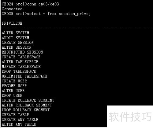 2、 从图中可以看出,用户ce01能够连接数据库并查看自身权限。尽管其拥有create session权限,但由于管理员在创建该用户时未授予with admin option选项,导致该权限无法实际使用。权限的传递需要管理员明确授权相应选项,否则即便显示存在权限,也无法真正执行相关操作,体现出权限管理中的严格控制机制。