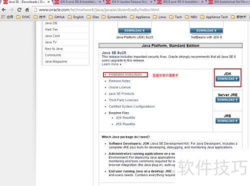 5、 Java JDK并非版本越高越合适,需结合自身实际条件选择,如电脑配置等因素。若不清楚如何选择,可参考JDK DOWNLOAD按钮左侧的Installation Instructions文档中的System Requirements部分,根据系统要求合理匹配JDK版本,确保安装运行稳定顺畅。