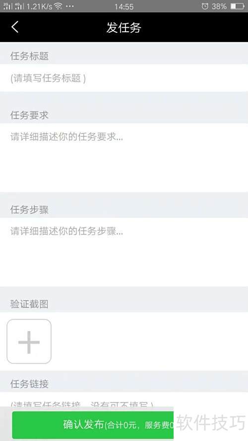 7、 点击首页底部中央的发任务,选定任务类别,依要求填写标题、注意事项及操作步骤等信息,核对无误后发布即可。
