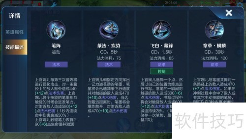 1、 所示,上官的三技能在命中自身主动技能后,三秒内可借助移动指令触发连续冲刺,完成五次冲刺后进入飞天状态,过程中不可中断。因此,可采用二技能衔接三技能,再接一技能并再次释放三技能的操作流程,实现飞天效果。