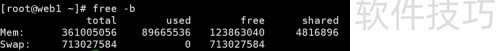 4、 使用free命令加-h选项,以字节为单位显示内存使用状况。