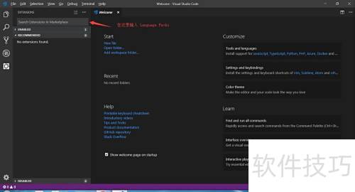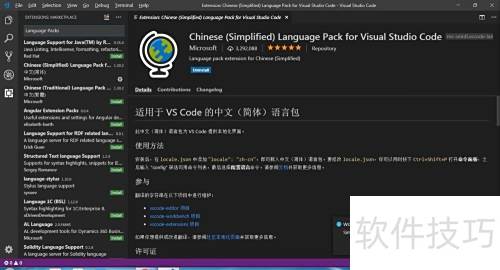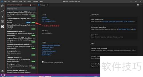 2、 按住Ctrl + Shift + X,进入左侧扩展界面,在搜索框中输入Language Packs,找到并点击简体中文语言包进行安装即可。