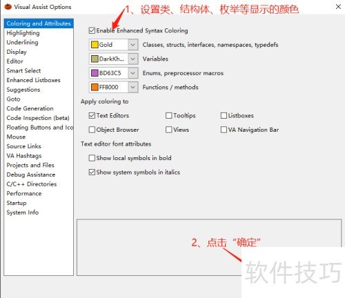 4、 打开Visual Assist Options界面,配置类、结构体、枚举的显示颜色,完成后点击确认即可。