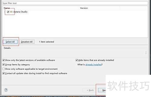 4、 点击确定后稍等片刻,若名称区域显示插件名,勾选左侧复选框或点击下方全选按钮,随后点击下一步即可继续操作。