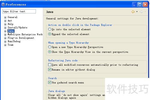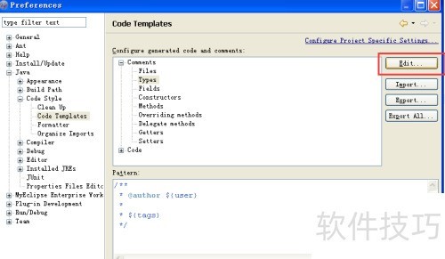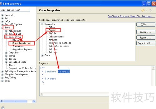 4、 进入首选项,选择 Java,点击代码样式,再进入代码模板,找到类型设置,具体位置所示。