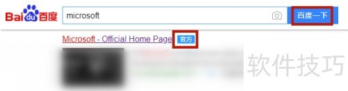2、 在浏览器搜索框输入microsoft,点击百度搜索,选择标有官网的结果进入网站。