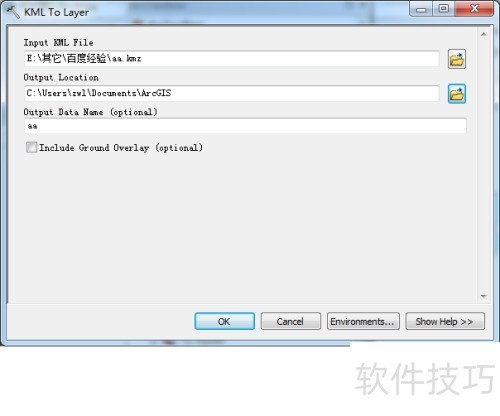 7、 在对话框中导入生成的aa.kml文件,设置输出路径与文件名,确认无误后点击确定即可。