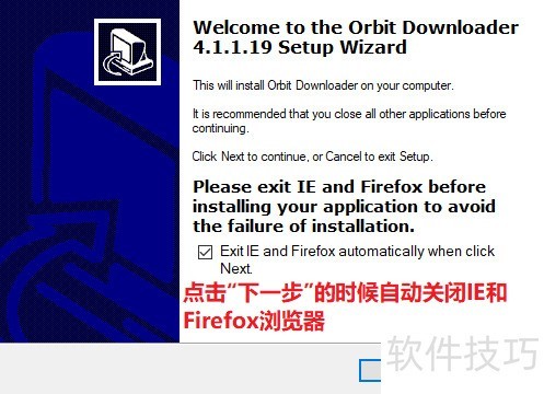 1、 下载并安装Orbit软件,双击运行安装程序,可选择自动关闭IE和Firefox浏览器,接受协议条款,自定义安装路径完成设置。