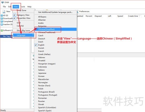 5、 启动软件后,默认显示英文界面,可通过View菜单下的Language选项,选择Chinese(Simplified)即可切换为简体中文界面。