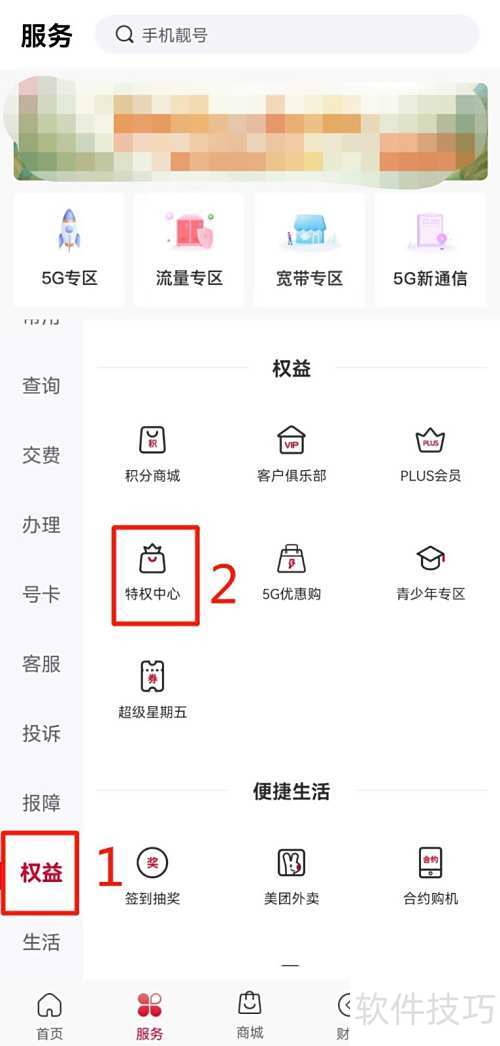 2、 进入页面后,依次点击权益和特权中心。