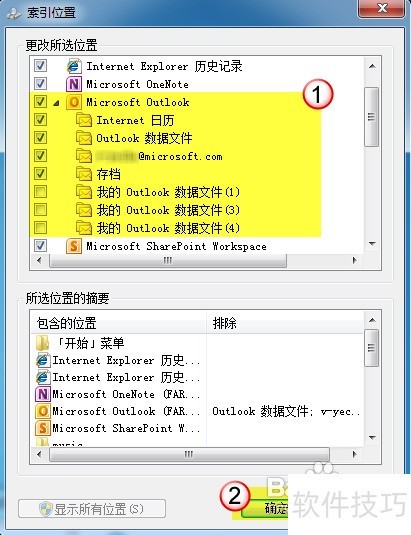 4、 在更改所选位置列表中,展开Microsoft Outlook,取消不需要的选项勾选,最后点击确定保存设置。