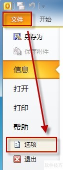 1、 启动 Outlook 2010,点击文件菜单中的选项按钮;若使用 Outlook 2007,则点击左上角的 Office 按钮,在弹出菜单中选择选项进行设置。