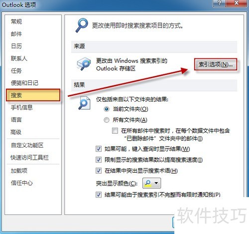 2、 弹出对话框后,先点击左侧的搜索,再按下索引选项按钮。