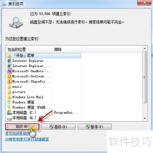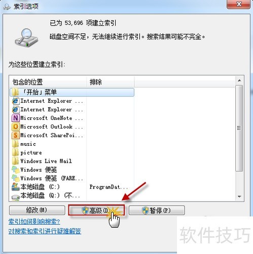 6、 打开索引选项窗口后,点击高级按钮即可。